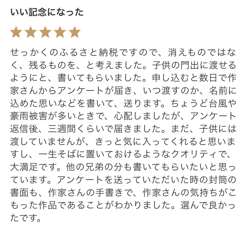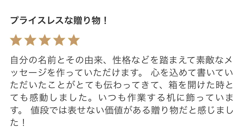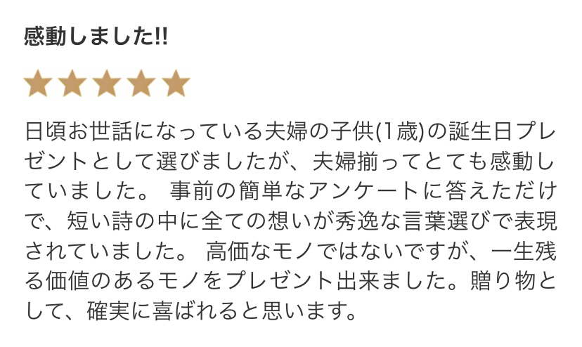 とてもドキドキしながら開けました。少しの間うっとり見とれて・・・感動にひたってました。私じゃこんな文章思い浮かばないなぁ・・と思いながら。主人に見せたら、「俺のは?」と自分のも欲しそうでしたよ(^-^)素敵なお仕事、お忙しいでしょうがこれからもずっと続けてくださいね。出産予定の友人もいるので、次は贈り物にしたいなぁと思います。