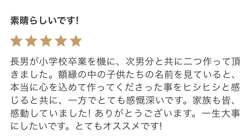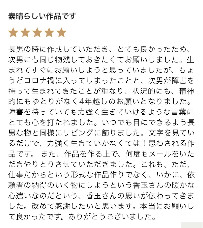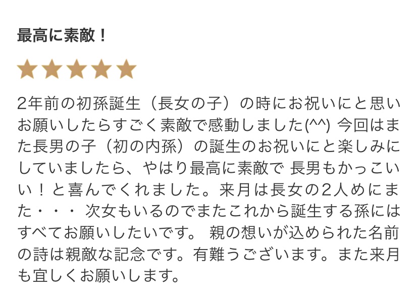 今日、作品が届きました!家に着くまで待ちきれず、エレベーターの中でわくわくしながら開けました♪言葉の綺麗さ、素晴らしさにとても感動し、思わず涙がでそうになりました。今はただわんぱくな仁汰ですが、「人の心をとらえる深い愛の持ち主」になってくれたらと思います!次の子の時もぜひお願いしたいと思います。本当にありがとうございました<(_ _)>